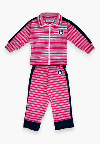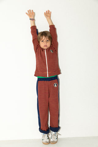 Notre trakcsuit style années 70, est composé du jogging évolutif et de la veste en maille rayée vintage 100% coton datant des années 80-90. Confectionnés à partir de tissus de stocks dormants, produit à Marseille en France.